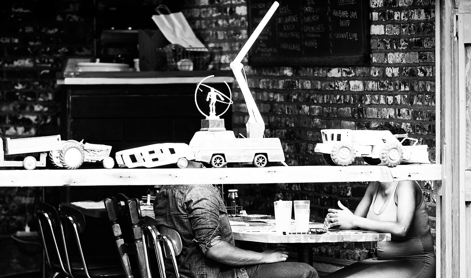 En la foto se ven a dos personas tomando un refresco y hablando. Podrían ser pareja, familia, amigos… no lo sabemos. Pero todo cambia de sentido en el momento en que ponemos las maquetas delante… lo obvio pasa a otro nivel y se convierte en una conceptualización (si existe algo así) de las relaciones humanas. En general las personas nos guiamos por los rostros y gestos para saber qué emociones tiene la gente que nos rodea, en este caso eso lo perdemos. Además la pose algo hierática de ambos tampoco dice mucho de si están contentos, tristes, preocupados o simplemente descansando. Cada persona que vea la foto puede sentir algo diferentes según sus propias vivencias. Si esta foto no tuviera las dos maquetas en las caras, sería totalmente diferente y quizás no tendría el mismo valor. En mi modesta opinión, esta foto es genial.