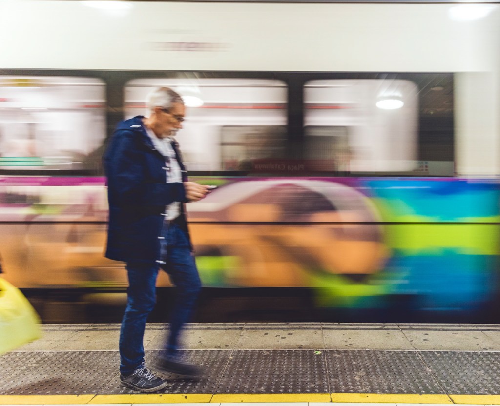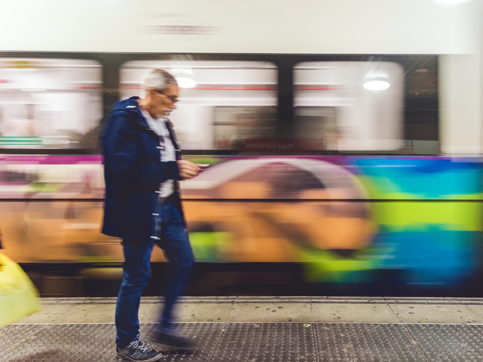 Un señor camina sin prestar atención al tren, que pasa en dirección contraria, mientras consulta algo en el teléfono.