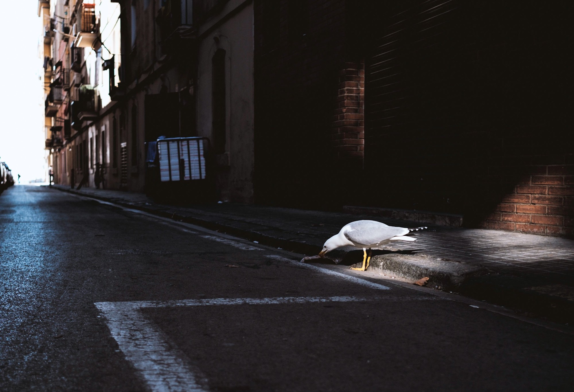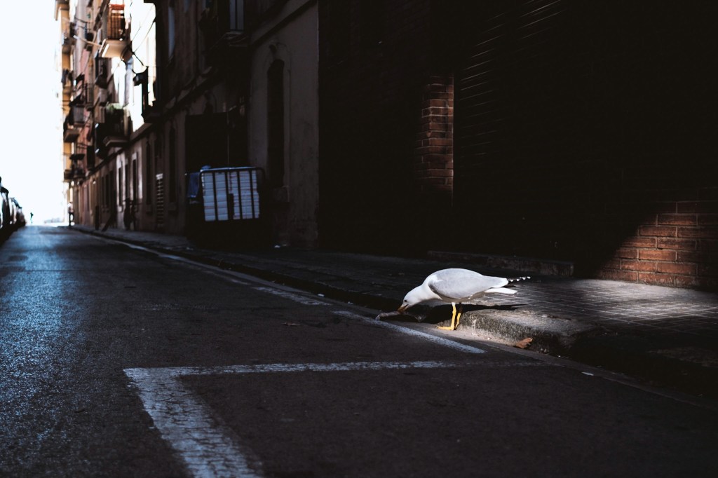 Estaba yo paseando por la Barceloneta, cámara en mano, y escuché un ruido. Al girarme vi que un hombre, claramente de un restaurante, le lanzaba un trozo de pescado a esta gaviota, que empezó a picotearlo y golpearlo para comérselo.