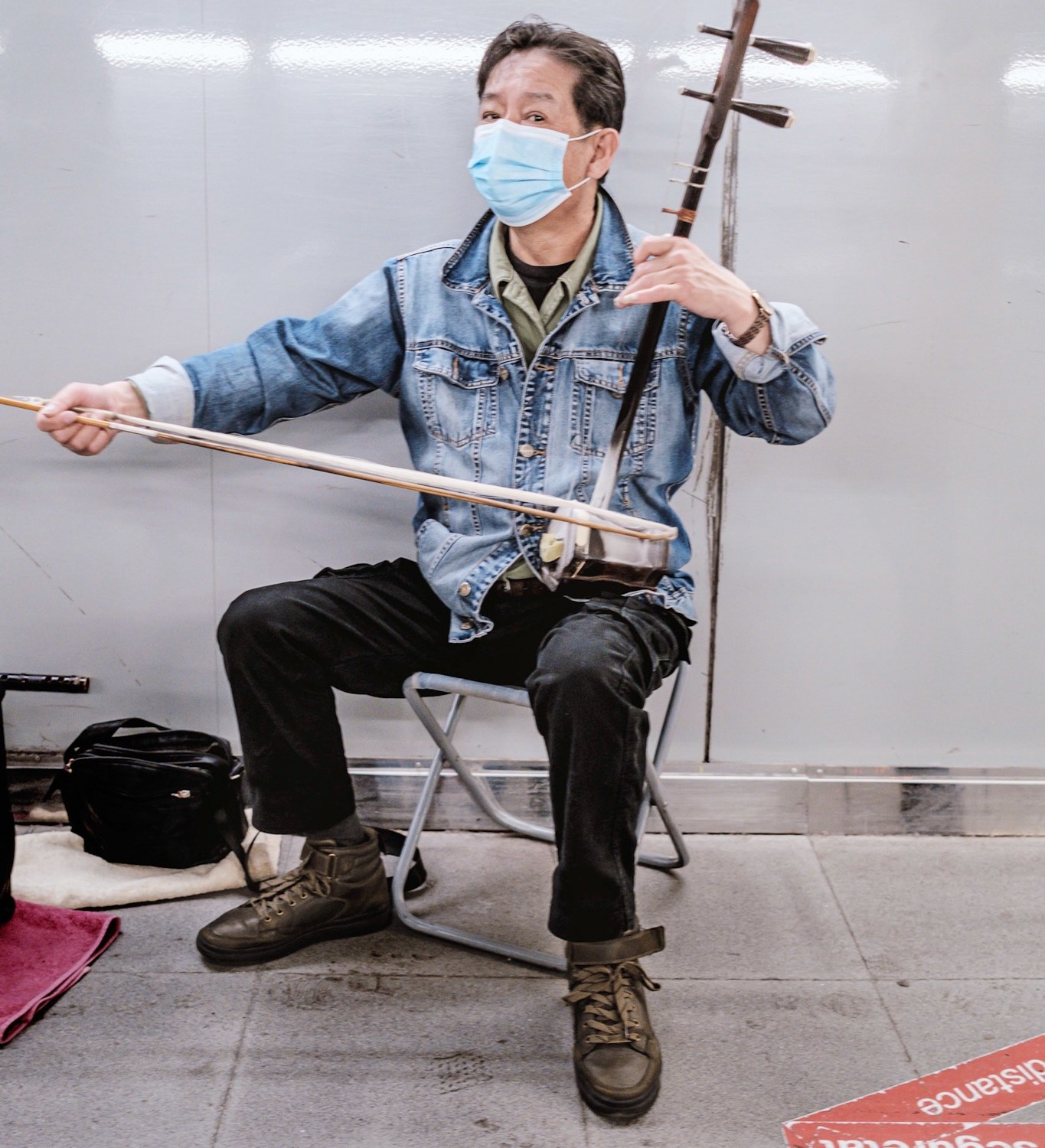 Este músico está tocando un Erhu, un instrumento originario de china y que da ese sonido tan característico, parecido al de un violín.