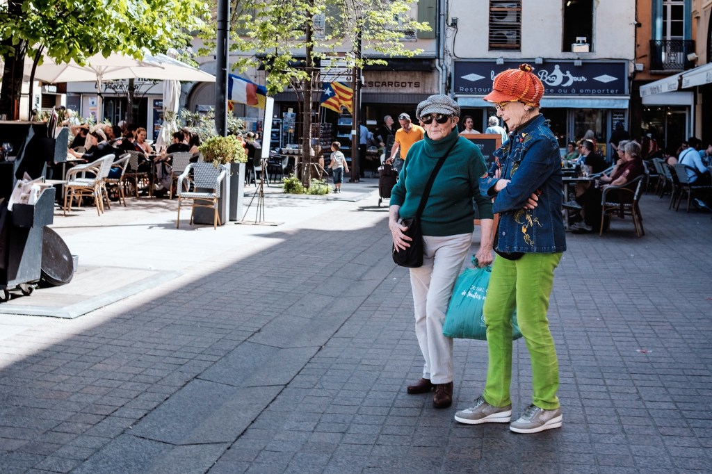 Ese día había mercado semanal en Perpignan y había bastante gente, estas dos mujeres llamaron mi atención por su colorido estilismo. El gorro naranja es hipnótico!