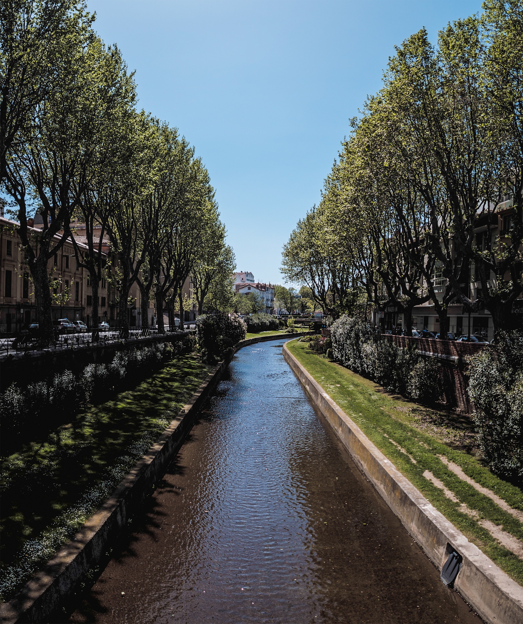 La Basse es el nombre de este río que atraviesa Perpignan, rodeado de árboles y una zona verde.