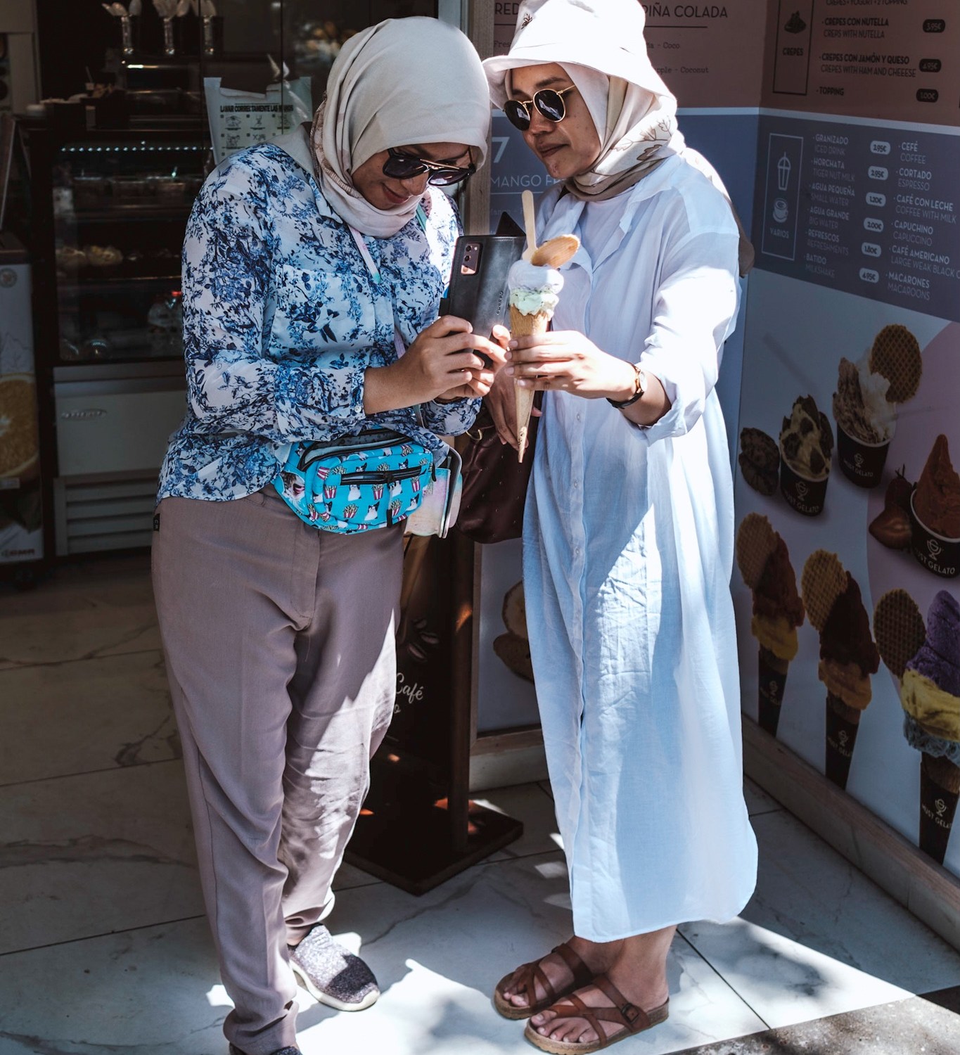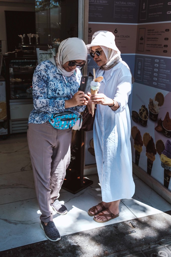 El helado como objeto artístico, lo más fotografiado del verano, omnipresente en las redes sociales. Estas dos turistas hacen una foto al suyo antes de degustarlo.