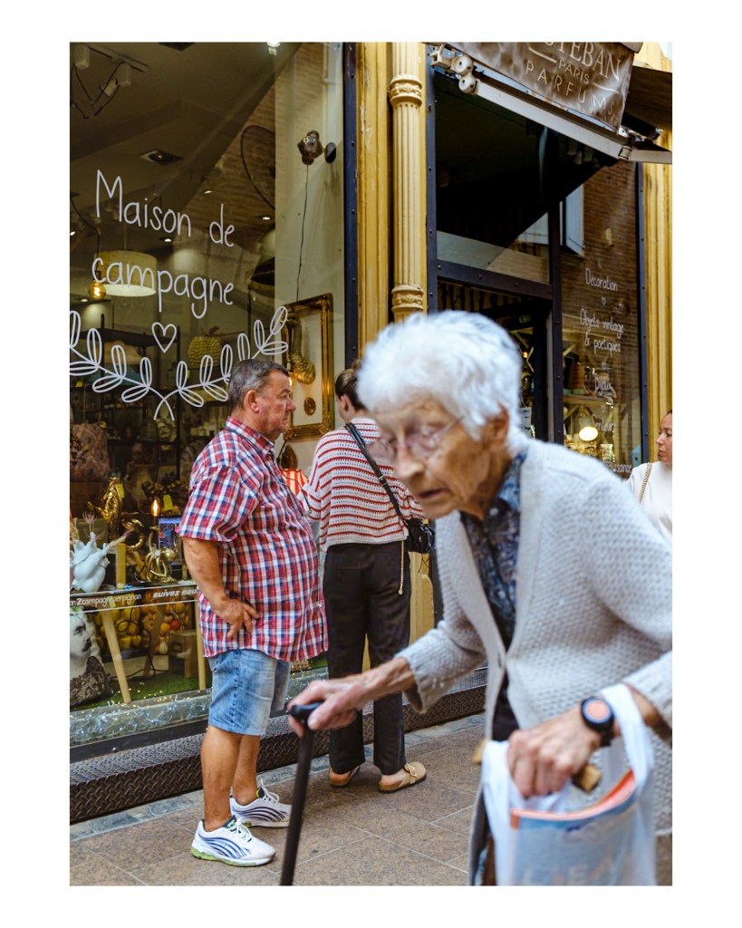 Esta calle de Perpiñán era un hervidero de historias que se desarrollaban a la vez, cada una con su propio ritmo. En primer plano, el movimiento decidido, una vida que avanza con la determinación que solo el tiempo otorga, enfocada en su camino. Justo detrás, en una capa diferente, encontramos la pausa: una pareja compartiendo un momento de curiosidad frente a un escaparate que susurra historias de hogar («Maison de campagne»).