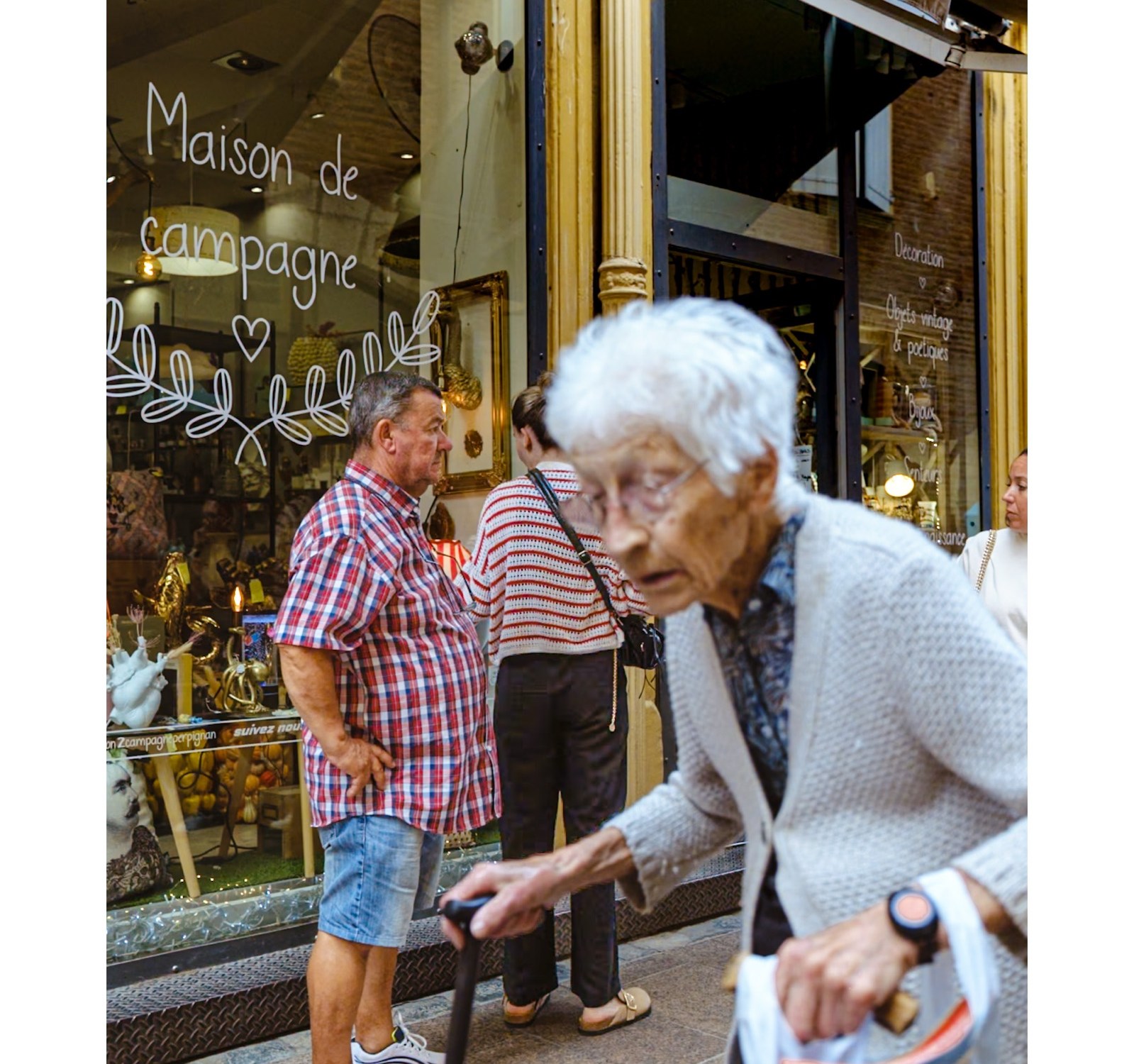 Esta calle de Perpiñán era un hervidero de historias que se desarrollaban a la vez, cada una con su propio ritmo. En primer plano, el movimiento decidido, una vida que avanza con la determinación que solo el tiempo otorga, enfocada en su camino. Justo detrás, en una capa diferente, encontramos la pausa: una pareja compartiendo un momento de curiosidad frente a un escaparate que susurra historias de hogar («Maison de campagne»).