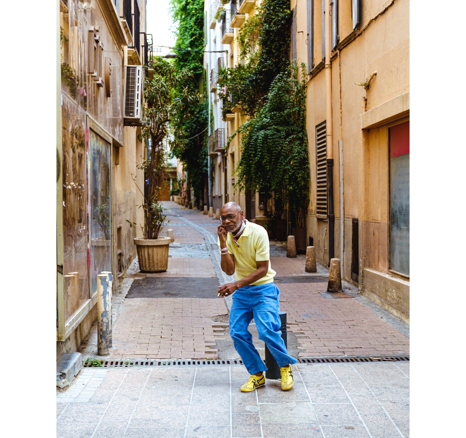 Mientras recorría este estrecho pasaje, me topé con esta vibrante escena. Justo al disparar, este hombre, con su estilo lleno de color, se percató de la cámara y amablemente se hizo a un lado. Es una situación muy común en la fotografía de calle: ese instante en el que la presencia del fotógrafo influye en la escena. Lejos de ser un «error», es un momento de pura autenticidad. 🚶♂️