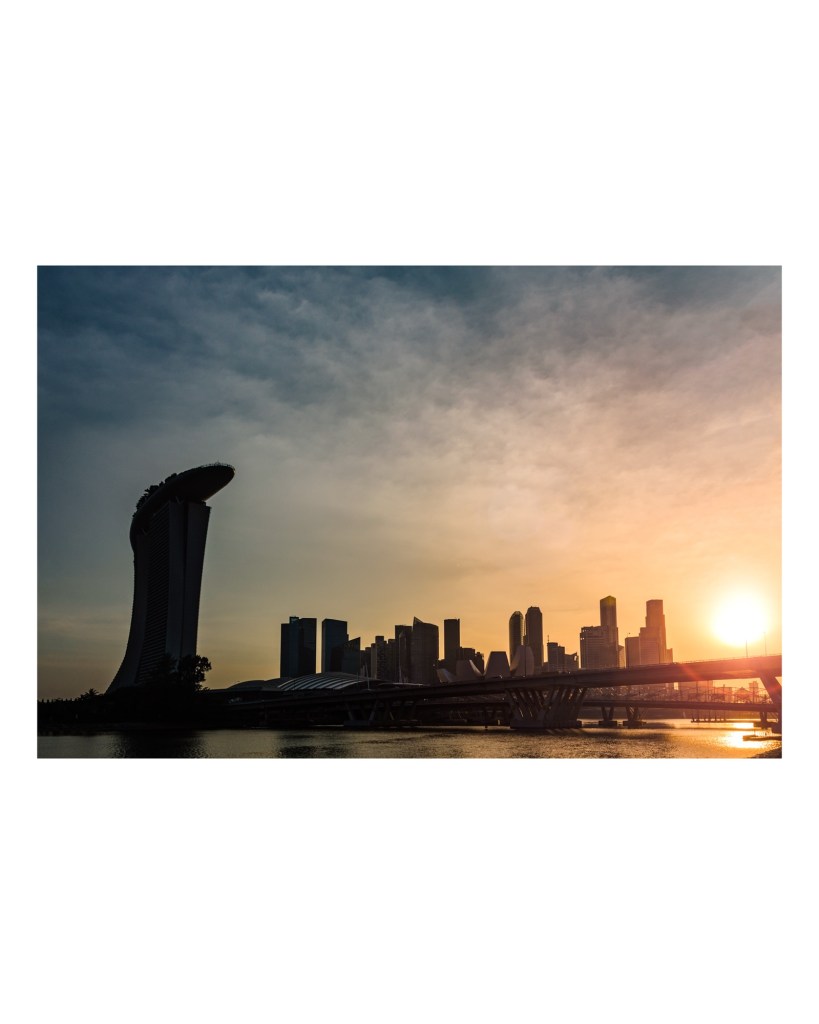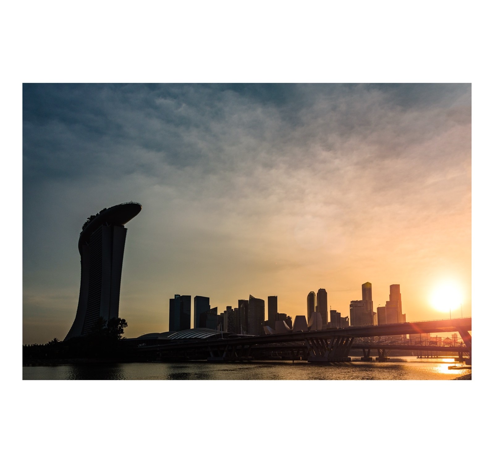 Recuerdo perfectamente la sensación de estar allí, viendo cómo el sol se escondía detrás del horizonte de Marina Bay. La luz era simplemente mágica. Poco a poco, el cielo se tiñó de esos tonos dorados y anaranjados intensos, mientras la icónica silueta de la ciudad, con el inconfundible edificio Marina Bay Sands, se oscurecía por completo.