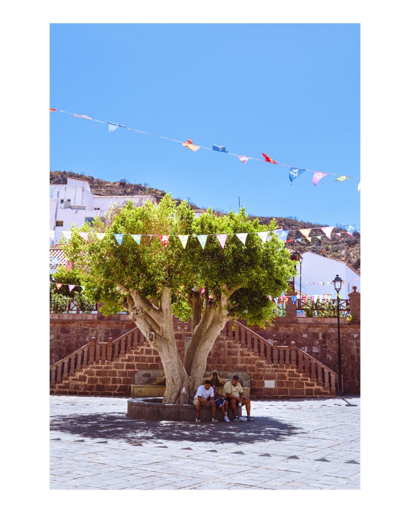 Hay lugares que invitan a detenerse, y la plaza de Tejeda es, sin duda, uno de ellos. En medio de un día soleado en Gran Canaria, este árbol no es solo parte del paisaje; es un refugio, un punto de encuentro y el protagonista silencioso de la vida local. 🌳☀️