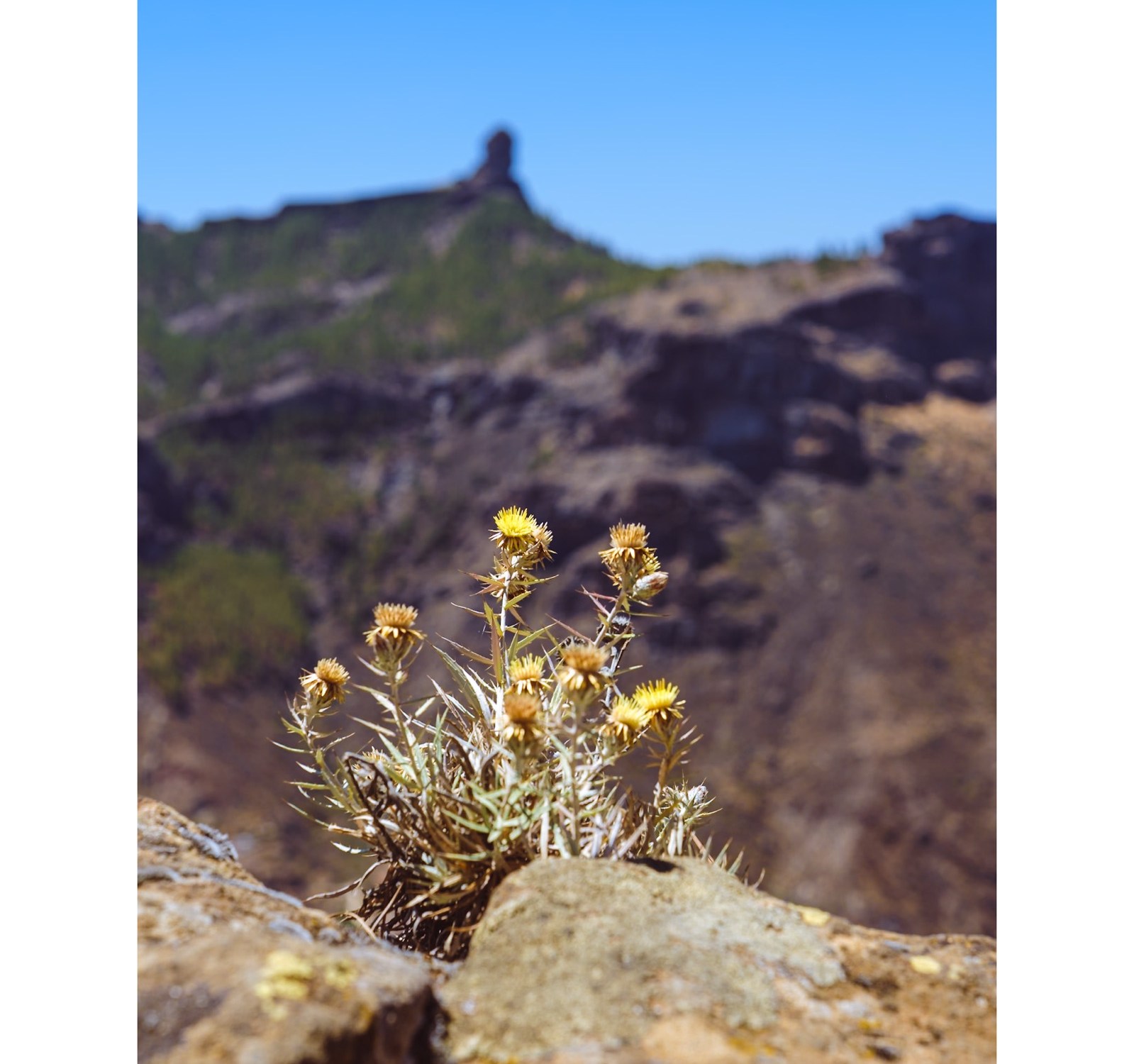 El Roque Nublo se alza como un vigilante ancestral en Gran Canaria, un monumento natural que nos recuerda la fuerza imponente de la naturaleza. En su base, sobre la roca firme, encuentro esta pequeña joya de la flora, luchando por florecer bajo el sol brillante y el cielo azul intenso. Es un recordatorio poderoso de la vida que se abre camino incluso en los entornos más rudos, un contraste hermoso entre la escala de lo inmenso y la perseverancia de lo diminuto.