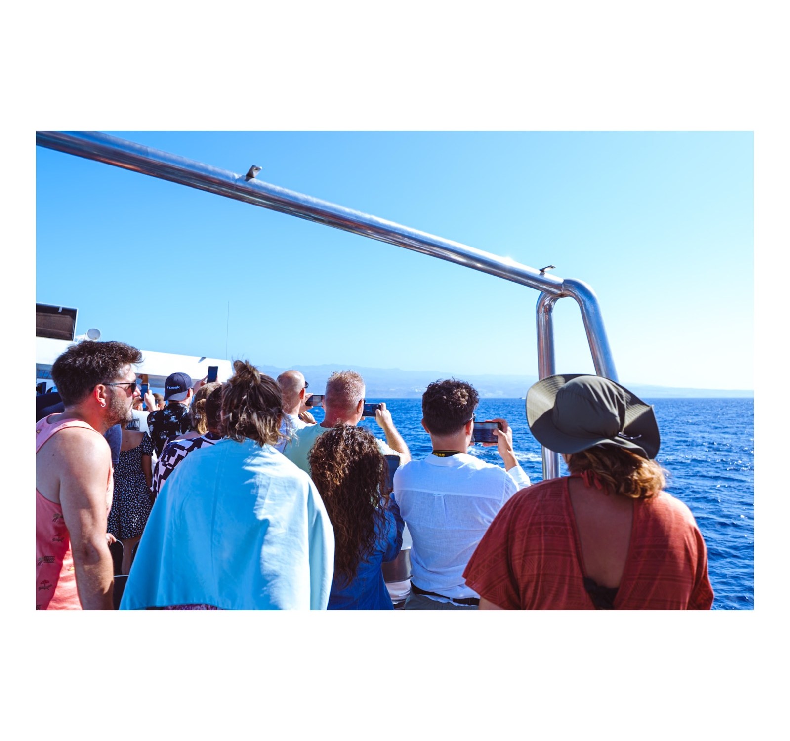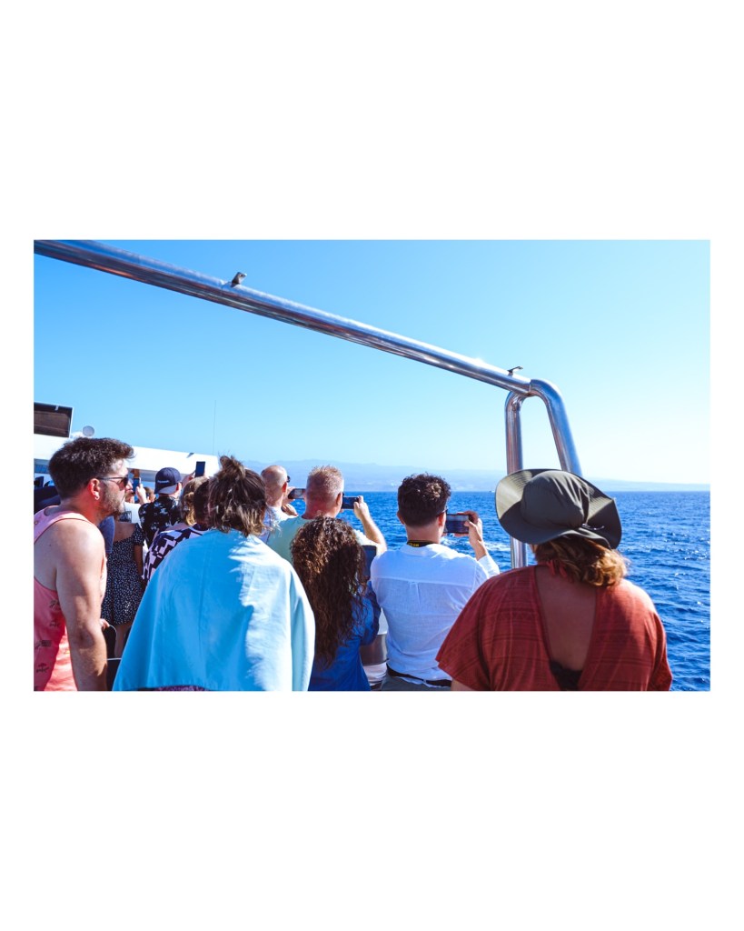 Durante una excursión en las costas de Gran Canaria, ocurrió lo esperado: en cuanto los delfines rompieron la superficie del agua, el barco se llenó de brazos en alto. Es un patrón que suelo buscar con mi cámara; me fascina capturar ese impulso tan humano y actual de querer poseer el instante a través de una pantalla. 📸🌊