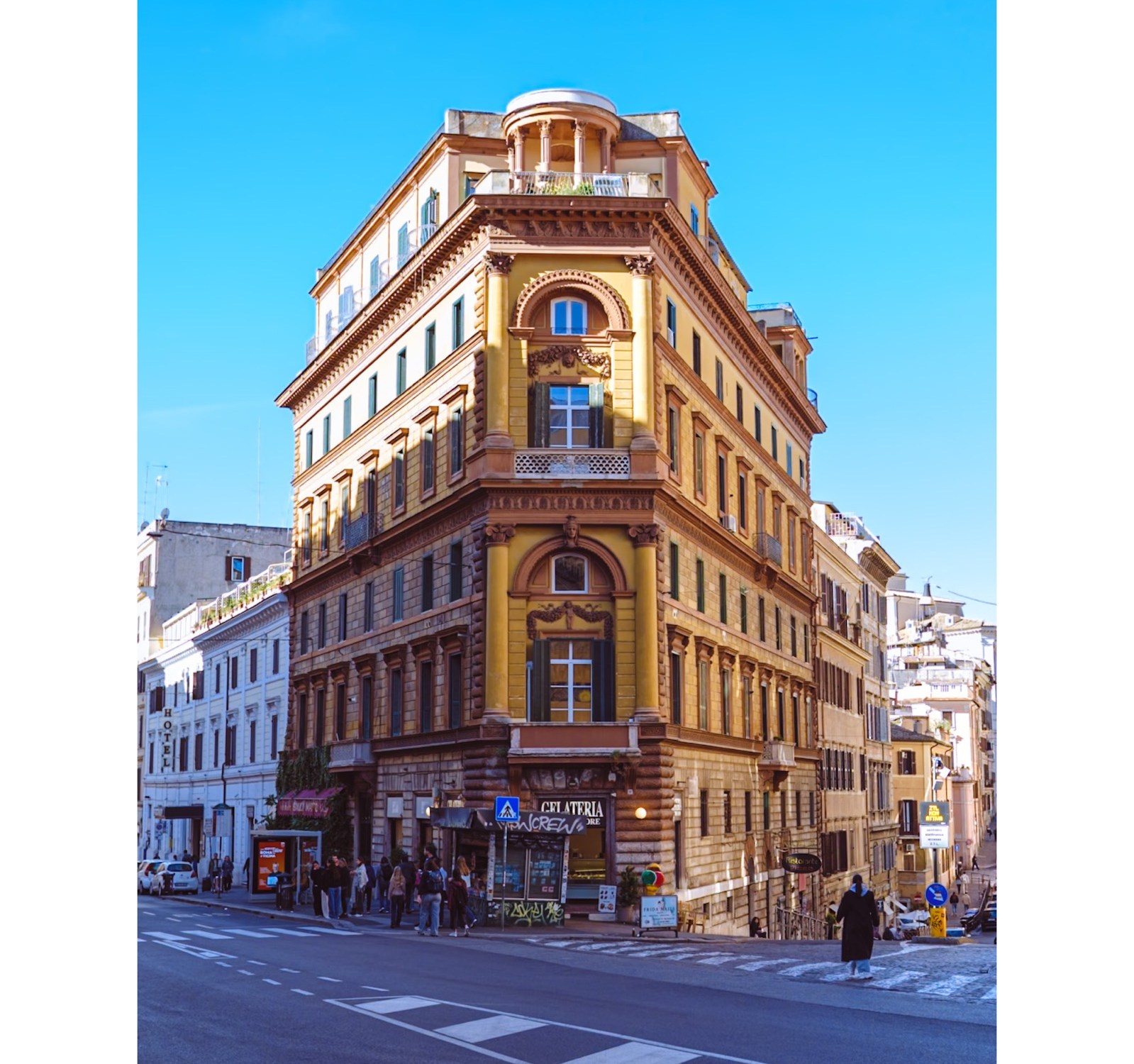 Su característica forma de cuña o proa de barco no es lo único que atrapa la mirada. Si te fijas en la parte superior, destaca un elegante templete circular que corona la azotea, un detalle arquitectónico que le da un aire distinguido sobre el caos encantador del tráfico romano. A sus pies, la vida fluye entre el aroma de la famosa Gelateria Santa Maria Maggiore y el movimiento constante de los quioscos de prensa.