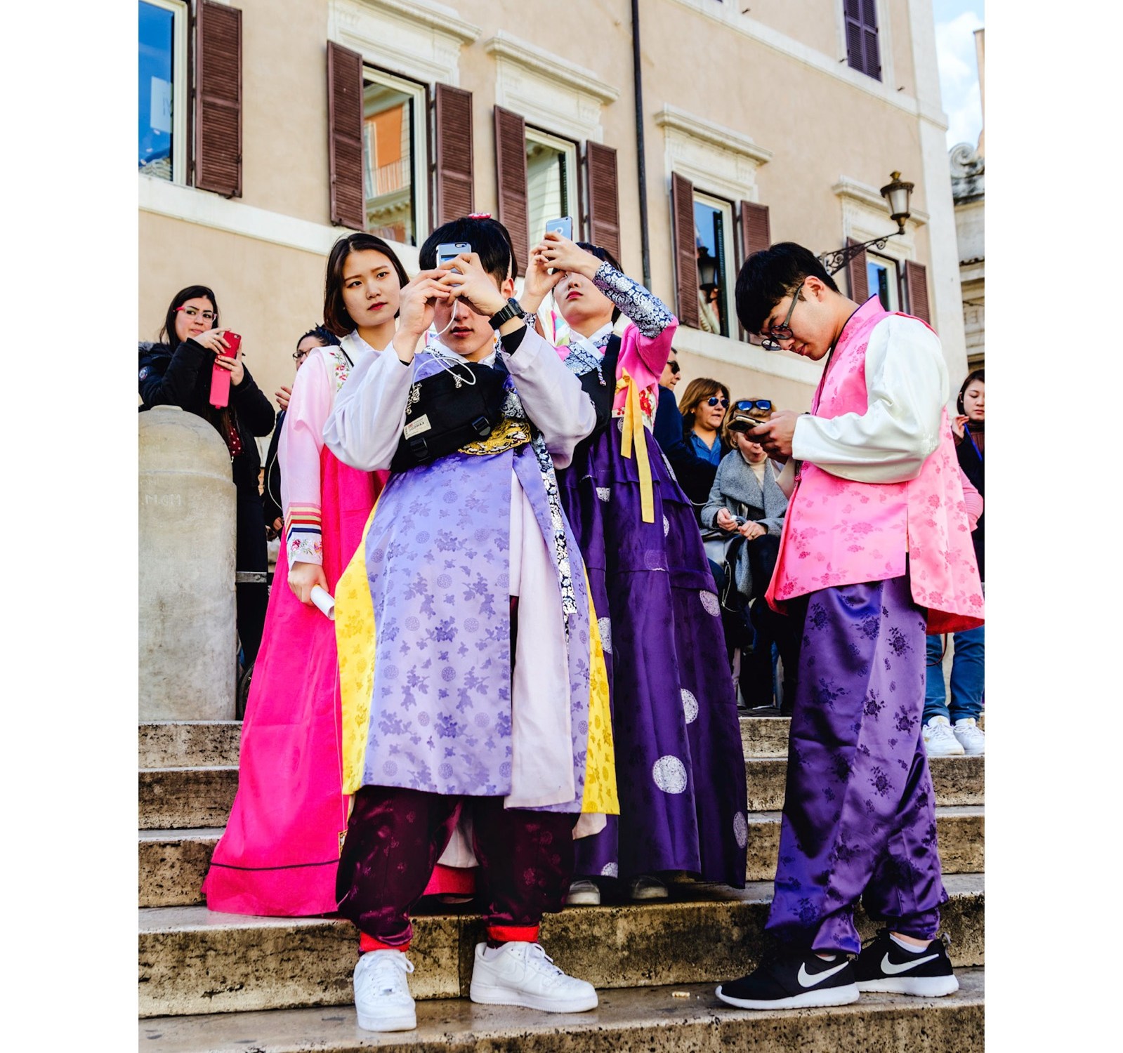 Hay momentos en los que el tiempo parece entrelazarse de forma mágica. Mientras caminaba por los alrededores de la Fontana di Trevi, me encontré con esta escena fascinante: la delicadeza y el colorido de los trajes tradicionales coreanos (hanbok) contrastando con la piedra histórica y el bullicio de Roma. 🏛️✨
