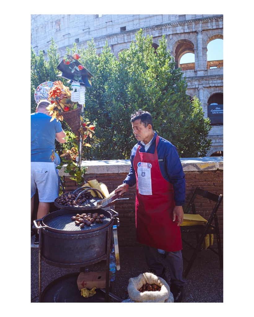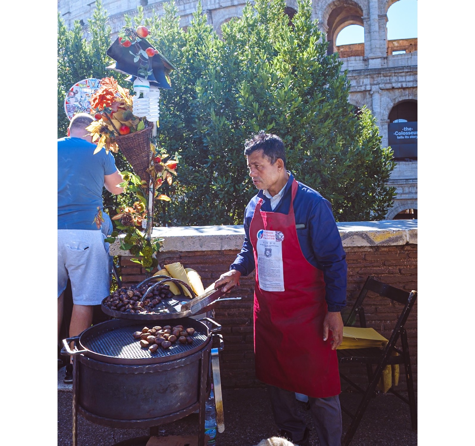 Caminar por Roma es hacer un viaje constante entre siglos de historia y pequeños momentos que nos anclan al presente. Frente a la imponente estructura del Coliseo, me encontré con este vendedor de castañas asadas, ajeno al bullicio de los turistas y concentrado en el calor de su brasa.