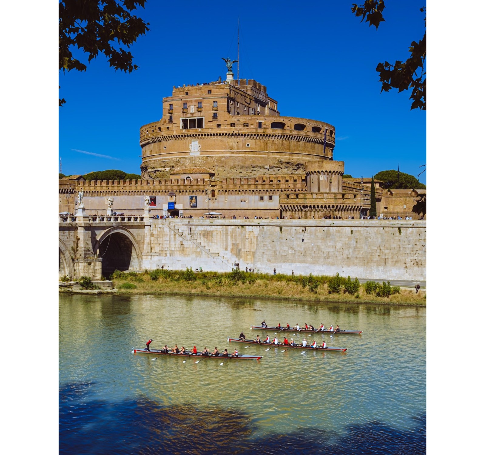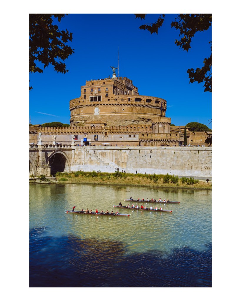 Pocas ciudades logran que el pasado y el presente convivan con tanta armonía como Roma. En esta toma, el imponente Castel Sant’Angelo observa en silencio cómo los remeros cortan las aguas del río Tíber, ajenos al paso de los siglos que guardan esos muros.
