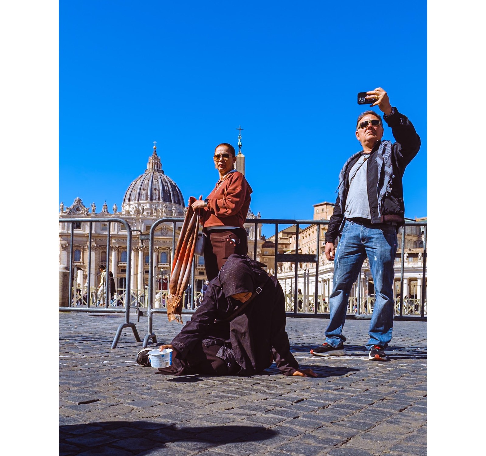 En esta toma, el contraste es casi crudo: mientras el turismo sigue su curso natural —buscando el encuadre perfecto para un selfie o capturando la inmensidad del cielo azul de Roma—, la realidad de la precariedad se asienta en el mismo empedrado. Es un recordatorio visual de las capas que componen nuestras ciudades; donde la fe, el arte y la historia convergen con las necesidades humanas más básicas que a menudo intentamos no ver.