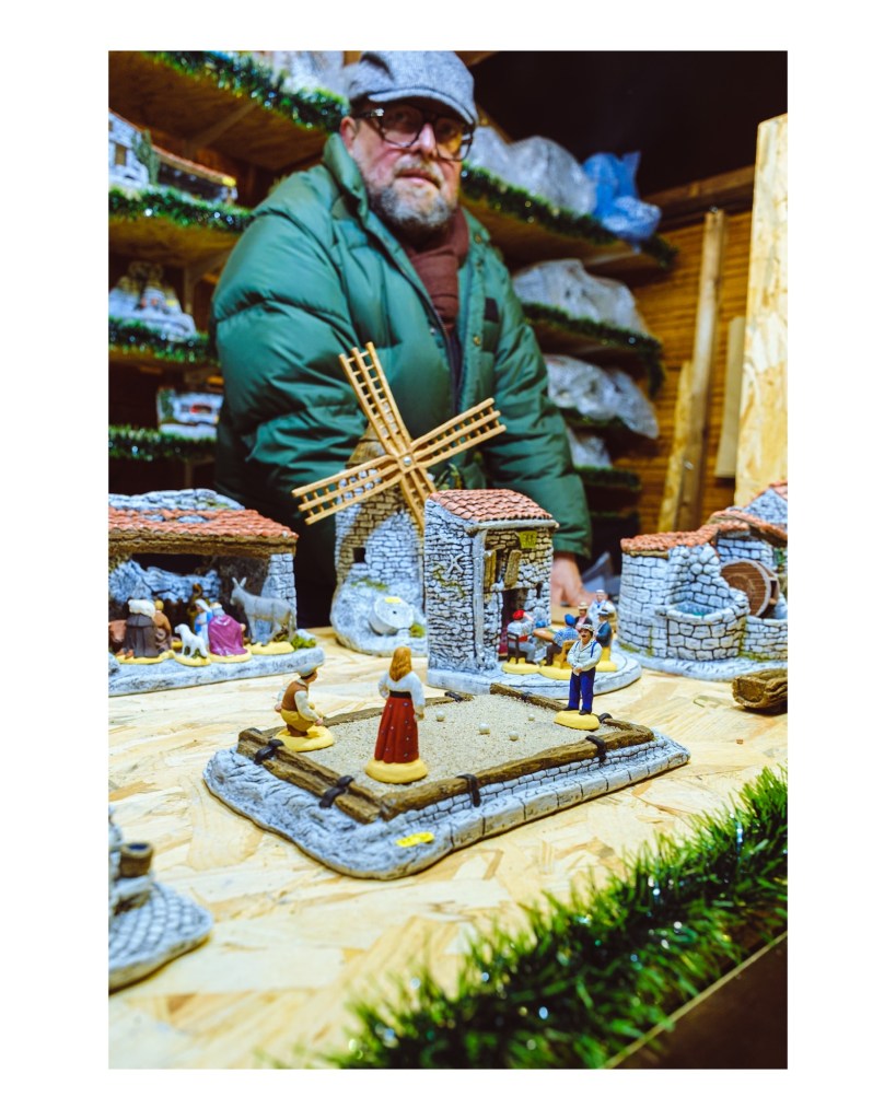 Me llamó mucho la atención esta escena de petanca en miniatura. Es fascinante cómo las tradiciones más arraigadas se cuelan en la decoración festiva, recordándonos que, incluso en invierno, el espíritu de la comunidad y el juego sigue vivo. El artesano, tras su mostrador rodeado de molinos y belenes, parecía el guardián de un pequeño mundo congelado en el tiempo. 📸🌍