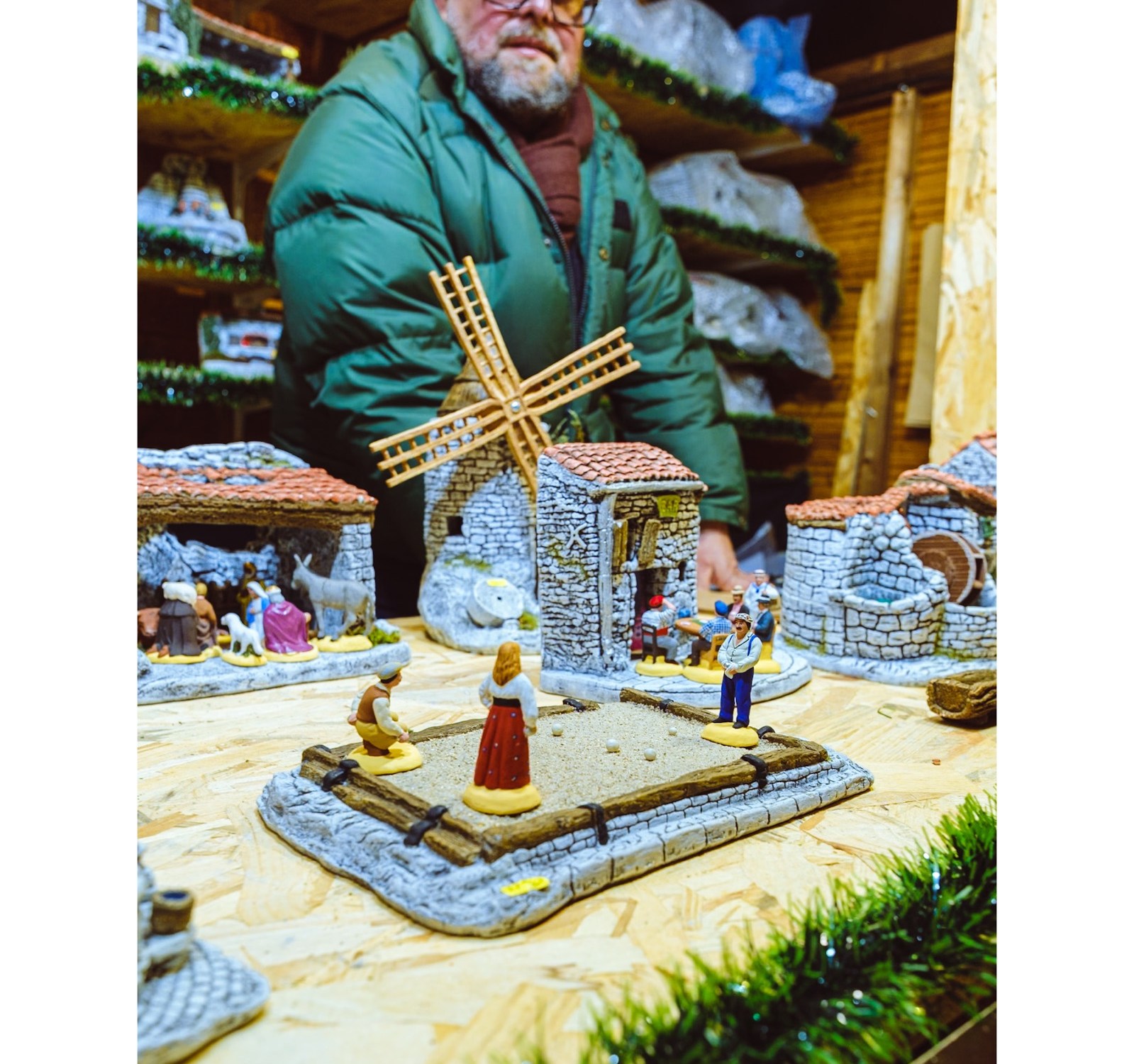 Me llamó mucho la atención esta escena de petanca en miniatura. Es fascinante cómo las tradiciones más arraigadas se cuelan en la decoración festiva, recordándonos que, incluso en invierno, el espíritu de la comunidad y el juego sigue vivo. El artesano, tras su mostrador rodeado de molinos y belenes, parecía el guardián de un pequeño mundo congelado en el tiempo. 📸🌍